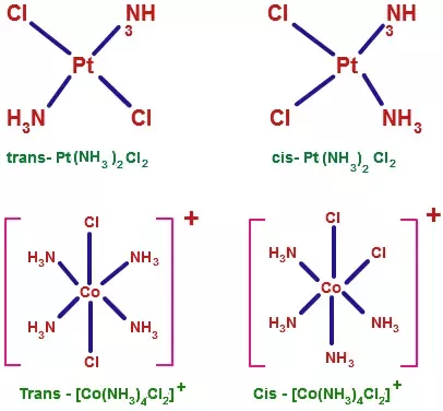 From the octahedral complexes of the types Ma6, Ma5b, Ma4b2, Ma3b3, only Ma4b2and Ma3b3, show two isomeric forms. In an octahedral (Ma2b4) complex (coordination number 6, a and b are unidentate ligands) there are two different positions that ligands can occupy relative to one another. In the two structures below it can be seen that the two ammonia ligands could be 90° or 180° relative to one another. This gives a cis- isomer and a trans- isomer. This type of isomerism also arises when bidentate ligands such as NH2CH2CH2NH2 (en) are present in the complex, e.g. [CoCl2(en)2]
